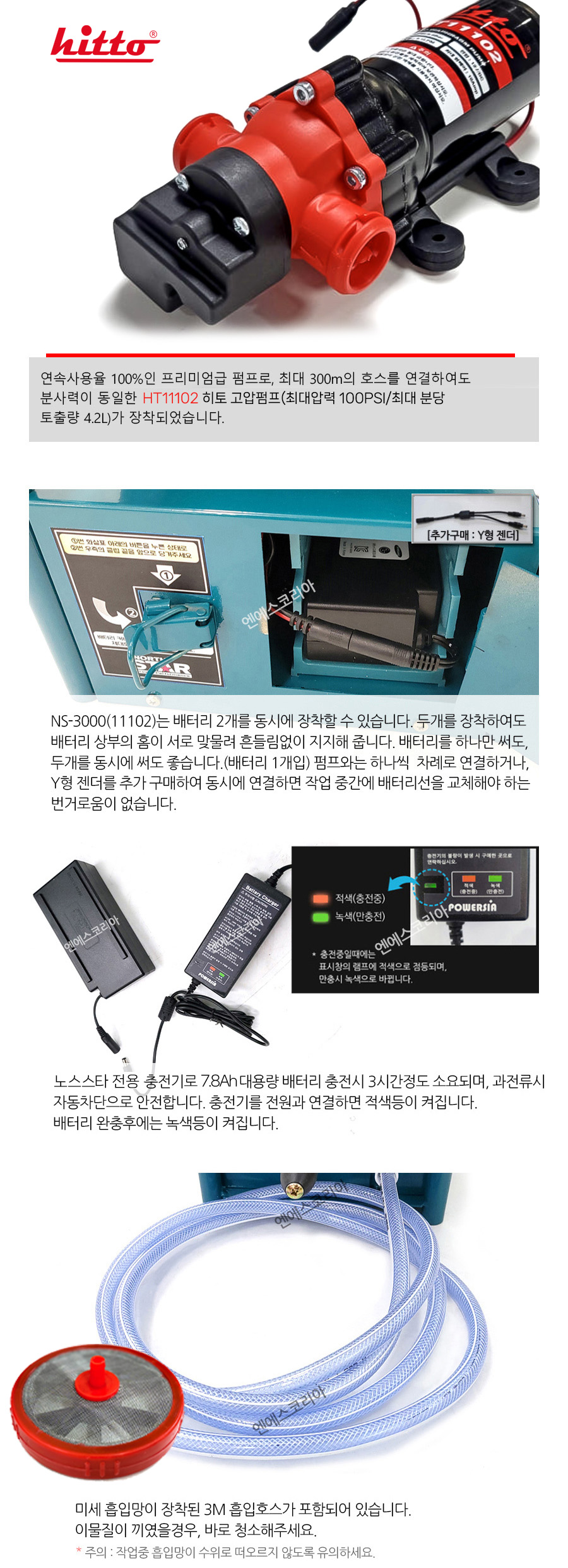NS-3000은 히토 HT11102 고압펌프를 장착하여 호스를 연장할 경우, 300M까지 압력이 일정하게 유지되어 분사되며