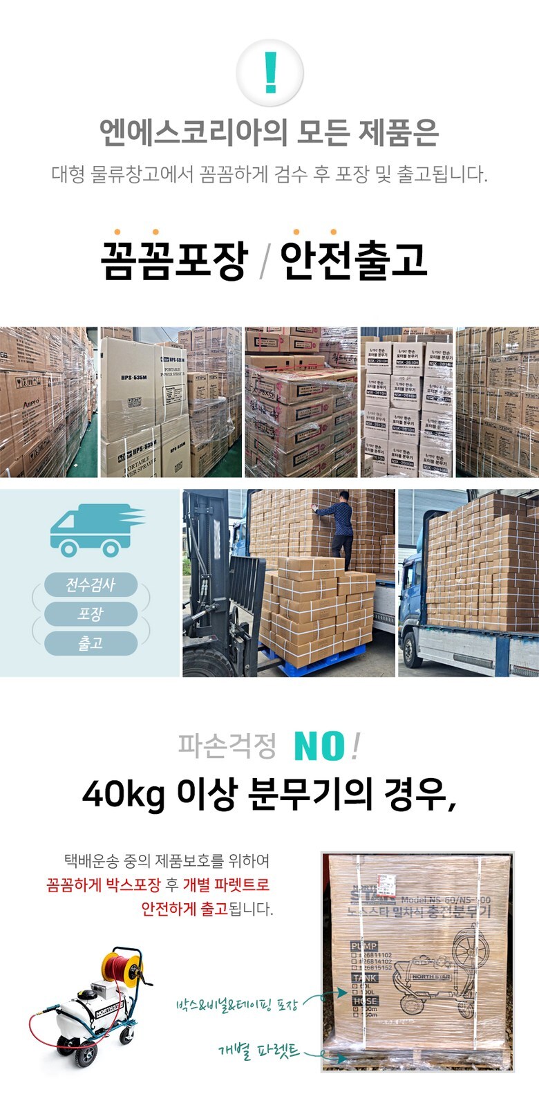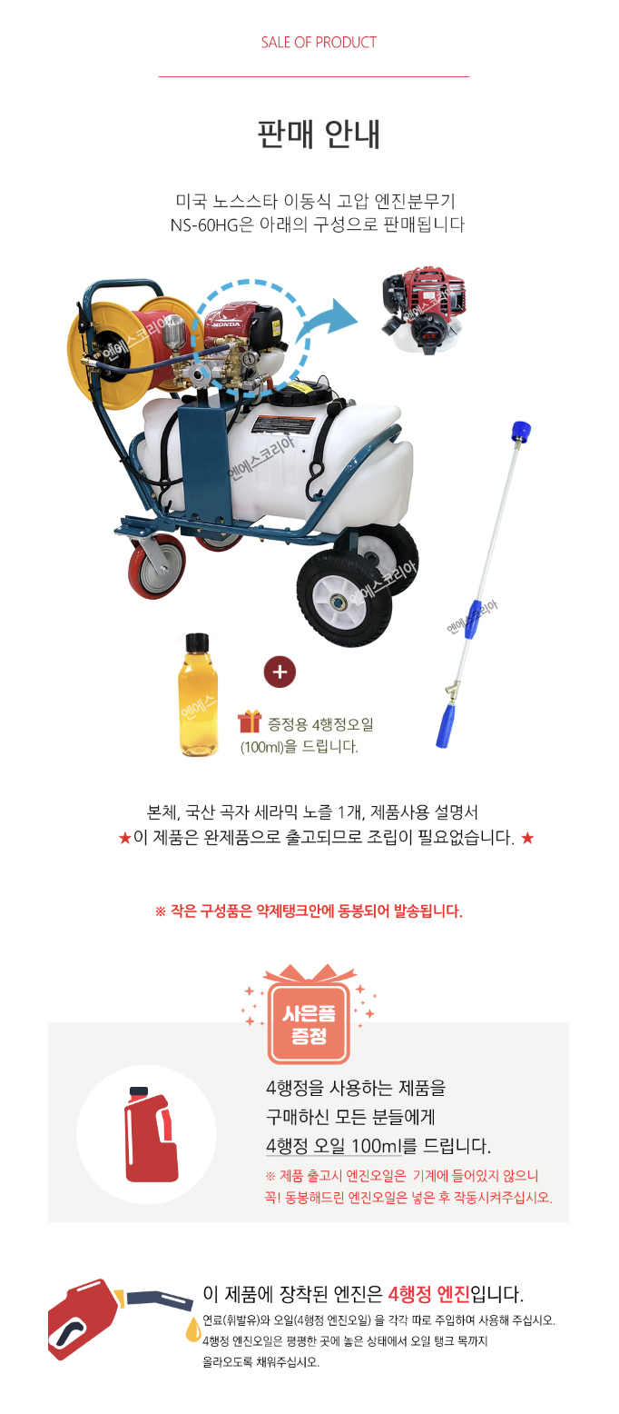 완제품으로 출고되어 조립이 필요없는 NS-60HG 엔진식분무기는 혼다 GX-35 4행정엔진을 장착한 밀차식 분무기입니다.