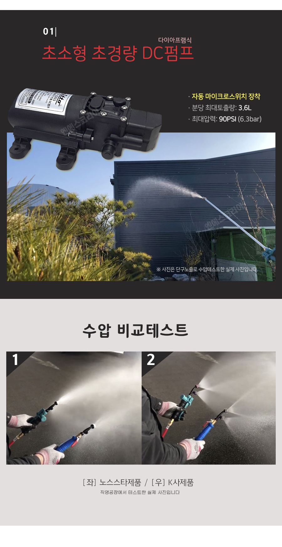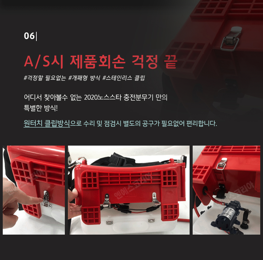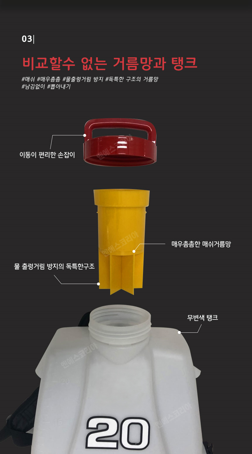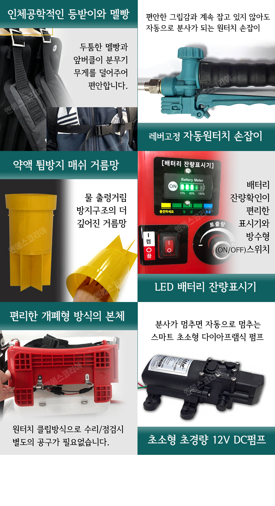 1)방수되는 전원스위치, 2)무단압력조절 다이얼, 3)더욱 촘촘한 매쉬거름망은 기본이며 A/S시 분무기의 심장, 펌프의 훼손을 덜기위한 4)개패형식의 본체로 디자인하여 더 오래 더 강하게 사용할 수 있습니다.